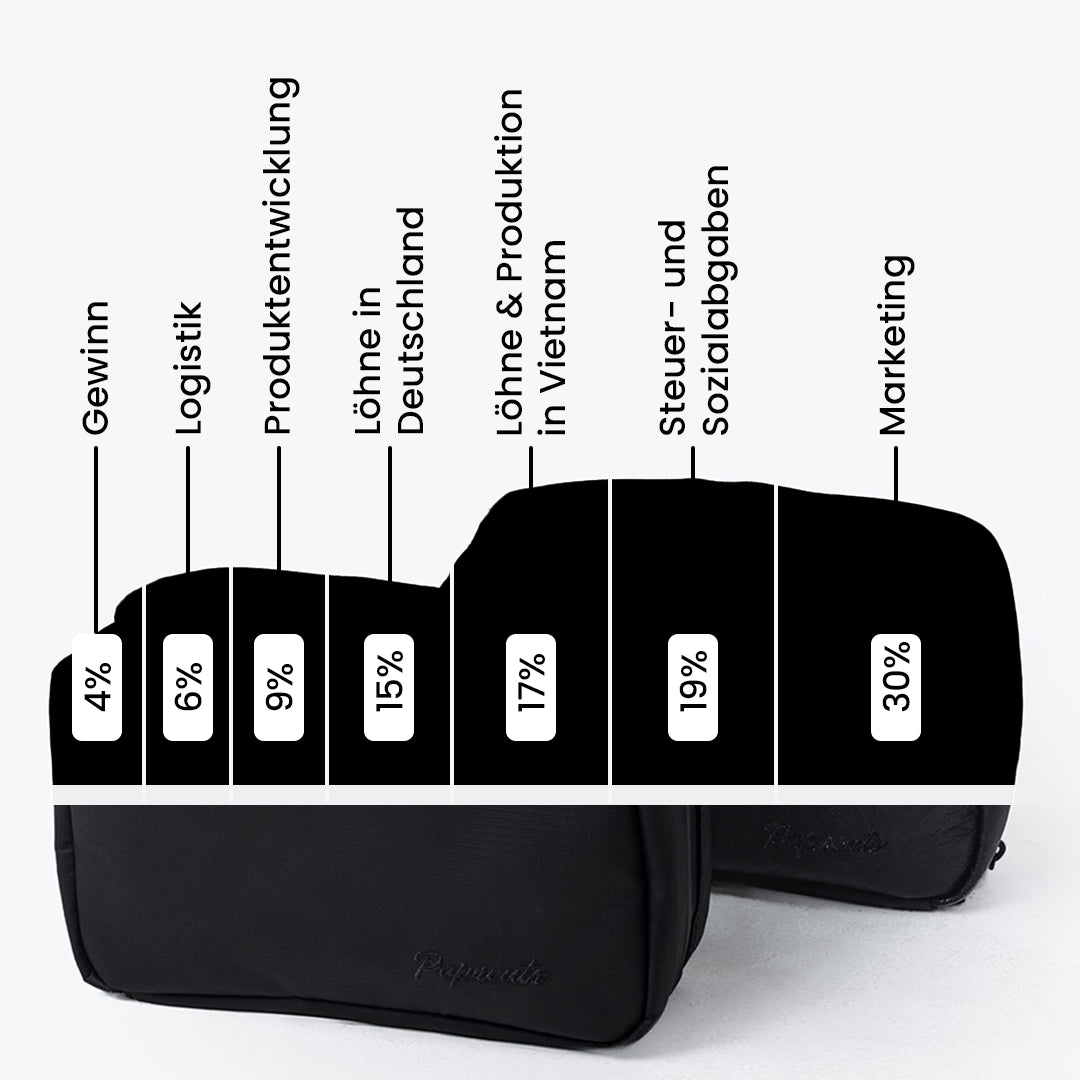 Wir legen viel Wert auf hohe Qualität und das ist nicht günstig. Aus diesem Grund wollen wir ganz transparent mit dir teilen, wie sich der Preis für unsere Oslo Tasche zusammensetzt. Den größten Teil nimmt leider das Marketing ein - wenn wir dich gar nicht erreichen, dann wirst du nie über die Existenz von diesem Beauty wissen. Auch die Löhne und die Produktionskosten sind nicht außer Acht zu lassen - denn uns ist es wichtig fair zu produzieren - ohne Kompromisse. Die 19% Mehrwertsteuer sind im Preis enthalten, diese müssen wir allerdings abgeben, zack 1/5 schon mal weg. Am Ende bleiben uns rund 4% Gewinn übrig, sofern das Produkt nicht im Sale ist.