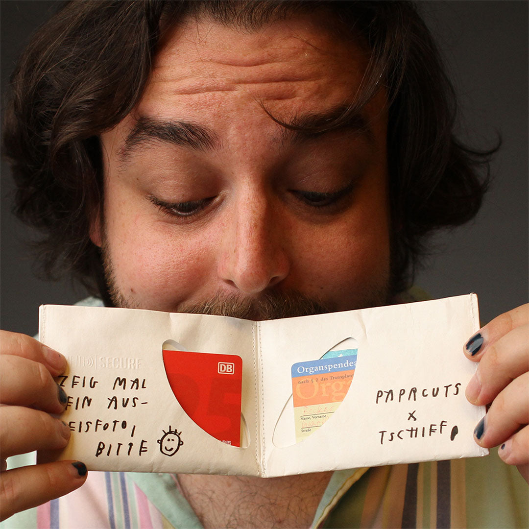 Die Idee zu Paprcuts entstand 2011, als Nils – ehrlicherweise leicht verkatert auf der Couch – aus Zeitungspapier ein schlankes Portemonnaie bastelte, weil ihm das fette Lederding in der Hosentasche auf die Nerven ging. Das erste Teil hielt nur drei Tage, aber die Idee war geboren – und wurde seitdem ständig weiterentwickelt. Heute sind unsere Produkte so robust, dass sie bei guter Pflege ein Leben lang halten. Oder können über eine Million verkaufte Produkte und zufriedene Kund*innen lügen?