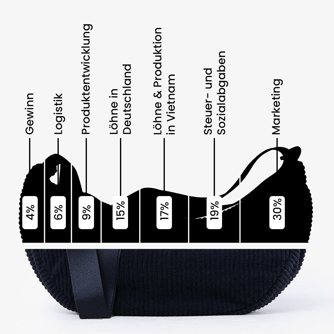 Wir legen viel Wert auf hohe Qualität und das ist nicht günstig. Aus diesem Grund wollen wir ganz transparent mit dir teilen, wie sich der Preis für unsere Valencia Bauchtasche zusammensetzt. Den größten Teil nimmt leider das Marketing ein - wenn wir dich gar nicht erreichen, dann wirst du nie über die Existenz von diesem Beauty wissen. Auch die Löhne und die Produktionskosten sind nicht außer Acht zu lassen - denn uns ist es wichtig, fair zu produzieren - ohne Kompromisse. Die 19% Mehrwertsteuer sind im Preis enthalten, diese müssen wir allerdings abgeben, zack 1/5 schon mal weg. Am Ende bleiben uns rund 4% Gewinn übrig, sofern das Produkt nicht im Sale verkauft wird.